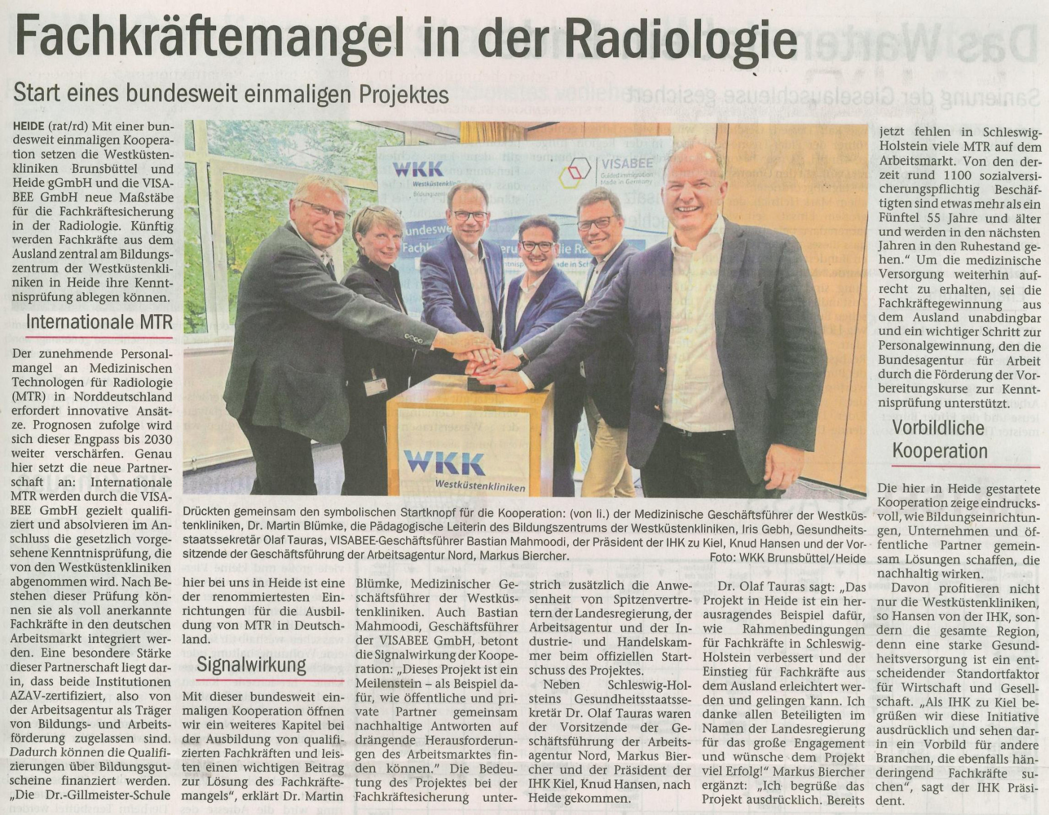 HEIDE (rat/rd) Mit einer bundesweit einmaligen Kooperation setzen die Westküstenkliniken Brunsbüttel und Heide gGmbH und die VISABEE GmbH neue Maßstäbe für die Fachkräftesicherung in der Radiologie. Künftig werden Fachkräfte aus dem Ausland zentral am Bildungszentrum der Westküstenkliniken in Heide ihre Kenntnisprüfung ablegen können.