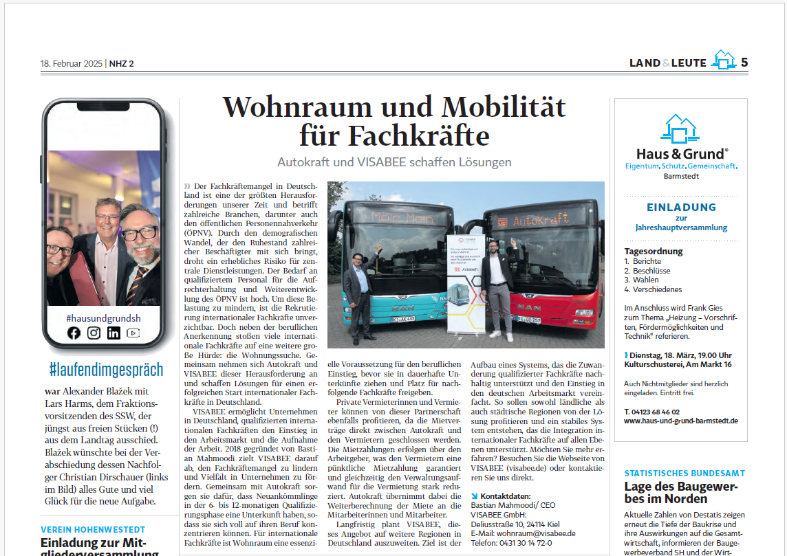 Der Fachkräftemangel in Deutschland ist eine der größten Herausforderungen unserer Zeit und betrifft zahlreiche Branchen, darunter auch den öffentlichen Personennahverkehr (ÖPNV). Durch den demographischen Wandel, der den Ruhestand zahlreicher Beschäftigter mit sich bringt, droht ein erhebliches Risiko für zentrale Dienstleistungen. Der Bedarf an qualifiziertem Personal für die Aufrechterhaltung und Weiterentwicklung des ÖPNV ist hoch. Um diese Belastung zu mindern, ist die Rekrutierung internationaler Fachkräfte unverzichtbar. Doch neben der beruflichen Anerkennung stoßen viele internationale Fachkräfte auf eine weitere große Hürde: die Wohnungssuche. Gemeinsam nehmen sich Autokraft und VISABEE dieser Herausforderung an und schaffen Lösungen für einen erfolgreichen Start internationaler Fachkräfte in Deutschland.